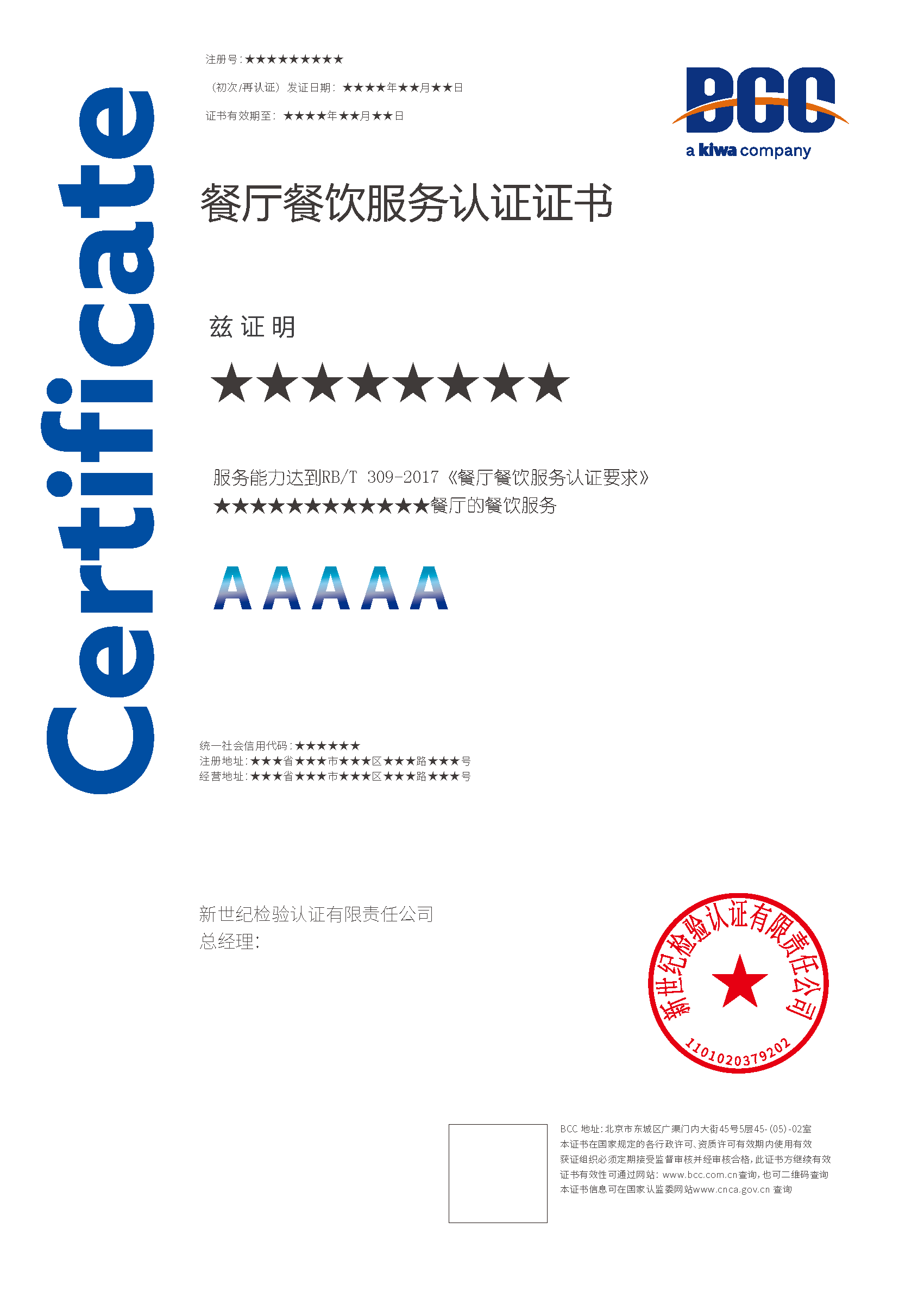 餐廳餐飲服務認證的證書有效期為三年,每年BCC會對獲證組織進行必要的監(jiān)督審查,證書到期前還要實施再認證審查。