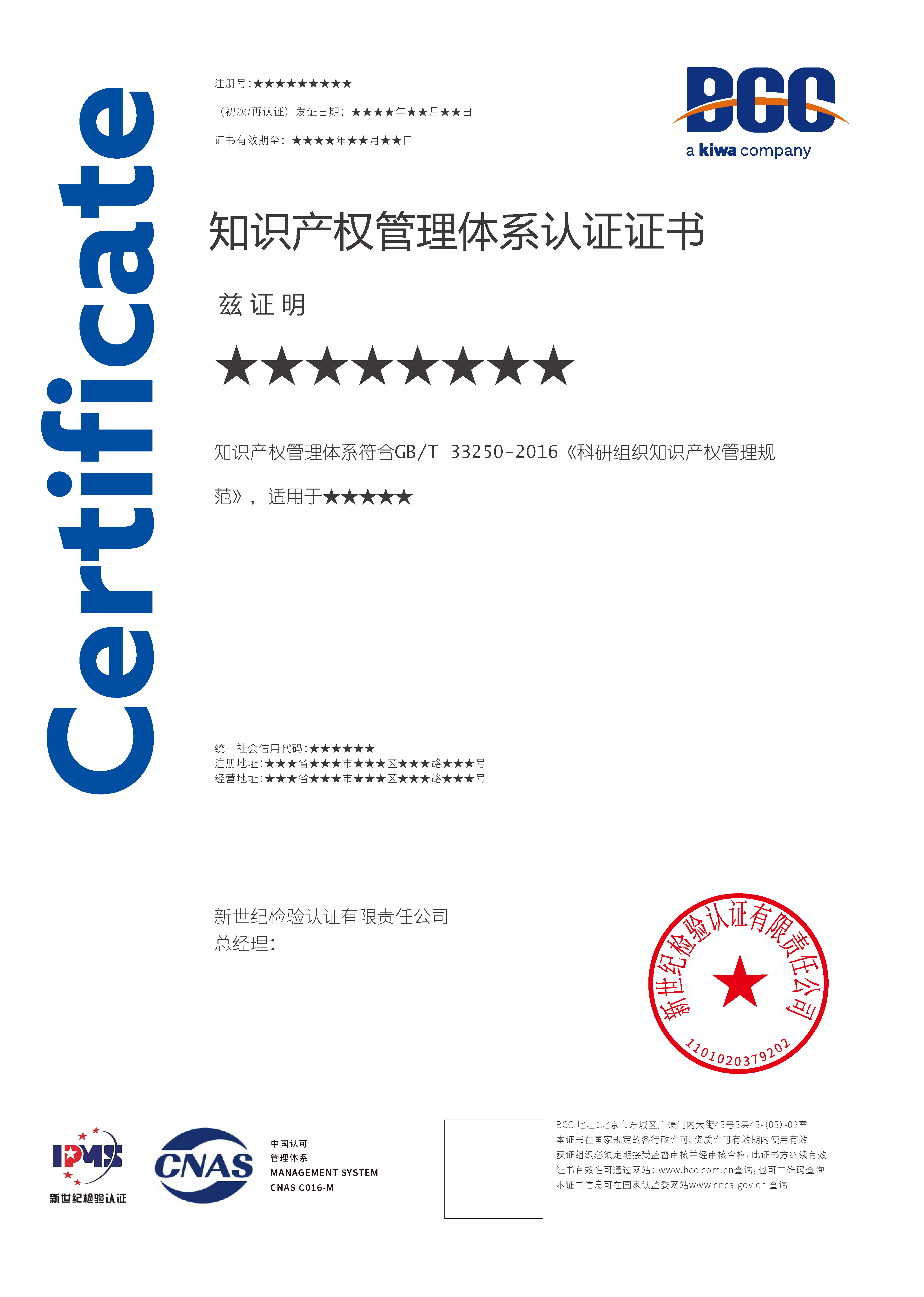 Kiwa BCC是首批獲CNAS認(rèn)可的知識產(chǎn)權(quán)認(rèn)證機構(gòu),可為企業(yè)頒發(fā)帶有“CNAS”標(biāo)識的知識產(chǎn)權(quán)管理體系認(rèn)證證書。認(rèn)證所用標(biāo)準(zhǔn)包括:GB/T 29490-2023《企業(yè)知識產(chǎn)權(quán)合規(guī)管理體系要求》、GB/T33250-2016《科研組織知識產(chǎn)權(quán)管理規(guī)范》、GB/T33251-2016《高等學(xué)校知識產(chǎn)權(quán)管理規(guī)范》。