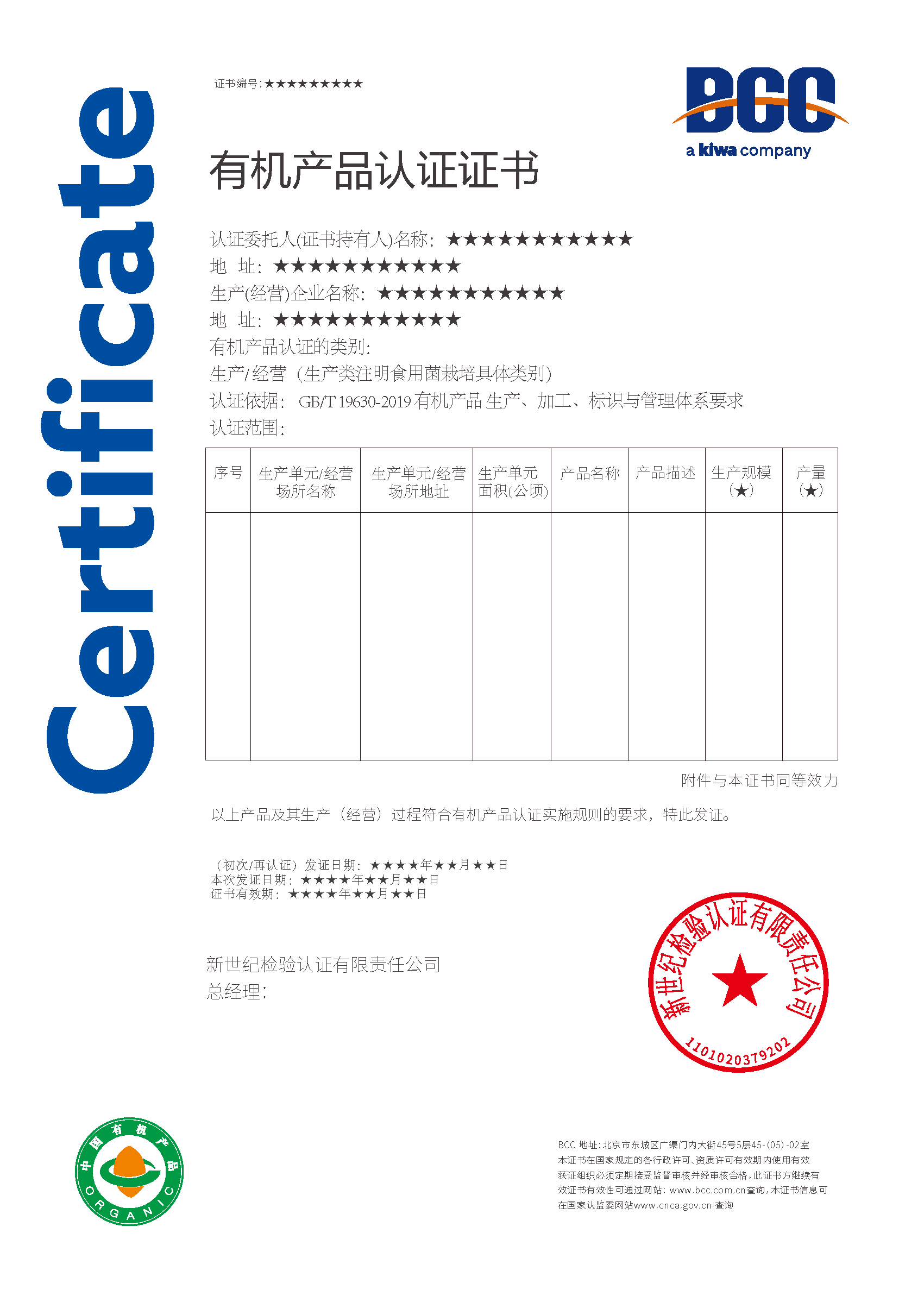 有機(jī)產(chǎn)品認(rèn)證證書樣式: