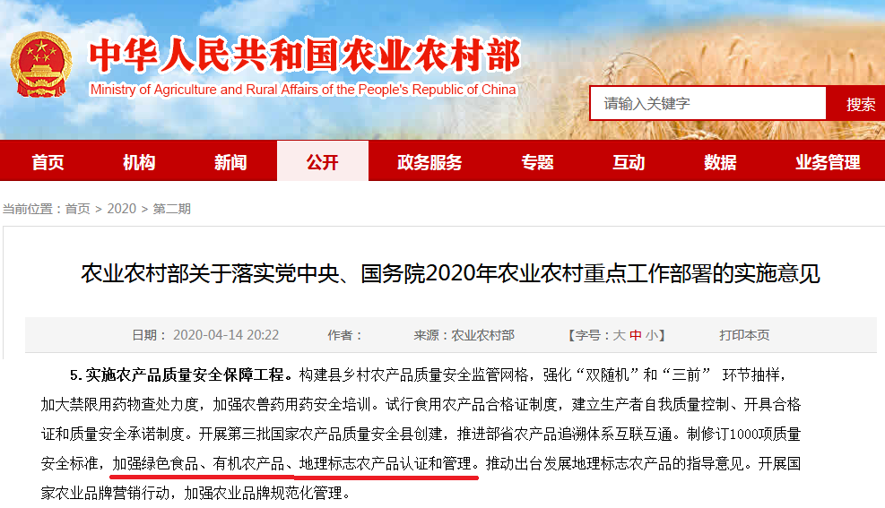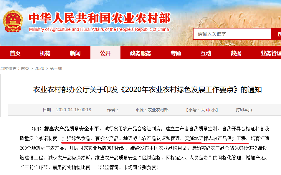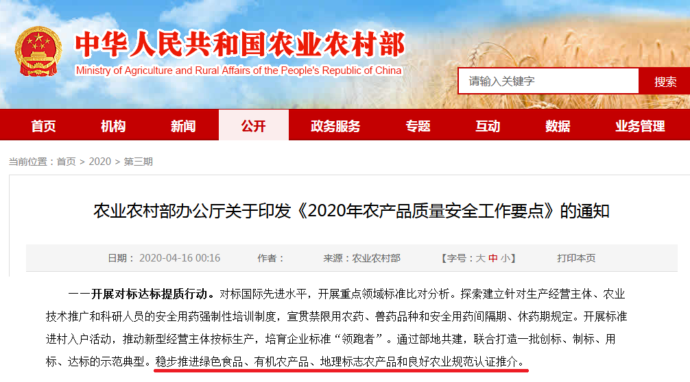 通知對于“加強(qiáng)綠色食品、有機(jī)農(nóng)產(chǎn)品、地理標(biāo)志農(nóng)產(chǎn)品認(rèn)證和管理,實施地理標(biāo)志農(nóng)產(chǎn)品保護(hù)工程,培育打造200個地理標(biāo)志農(nóng)產(chǎn)品。”的描述,要全面提高農(nóng)產(chǎn)品質(zhì)量安全水平。