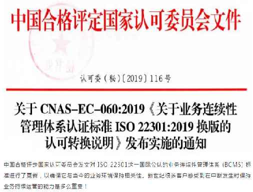 2019年12月31日,中國(guó)合格評(píng)定國(guó)家認(rèn)可委員會(huì)(CNAS)發(fā)布了關(guān)于CNAS-EC-060:2019《關(guān)于業(yè)務(wù)連續(xù)性管理體系認(rèn)證標(biāo)準(zhǔn)ISO22301:2019換版的認(rèn)可轉(zhuǎn)換說明》發(fā)布實(shí)施的通知。