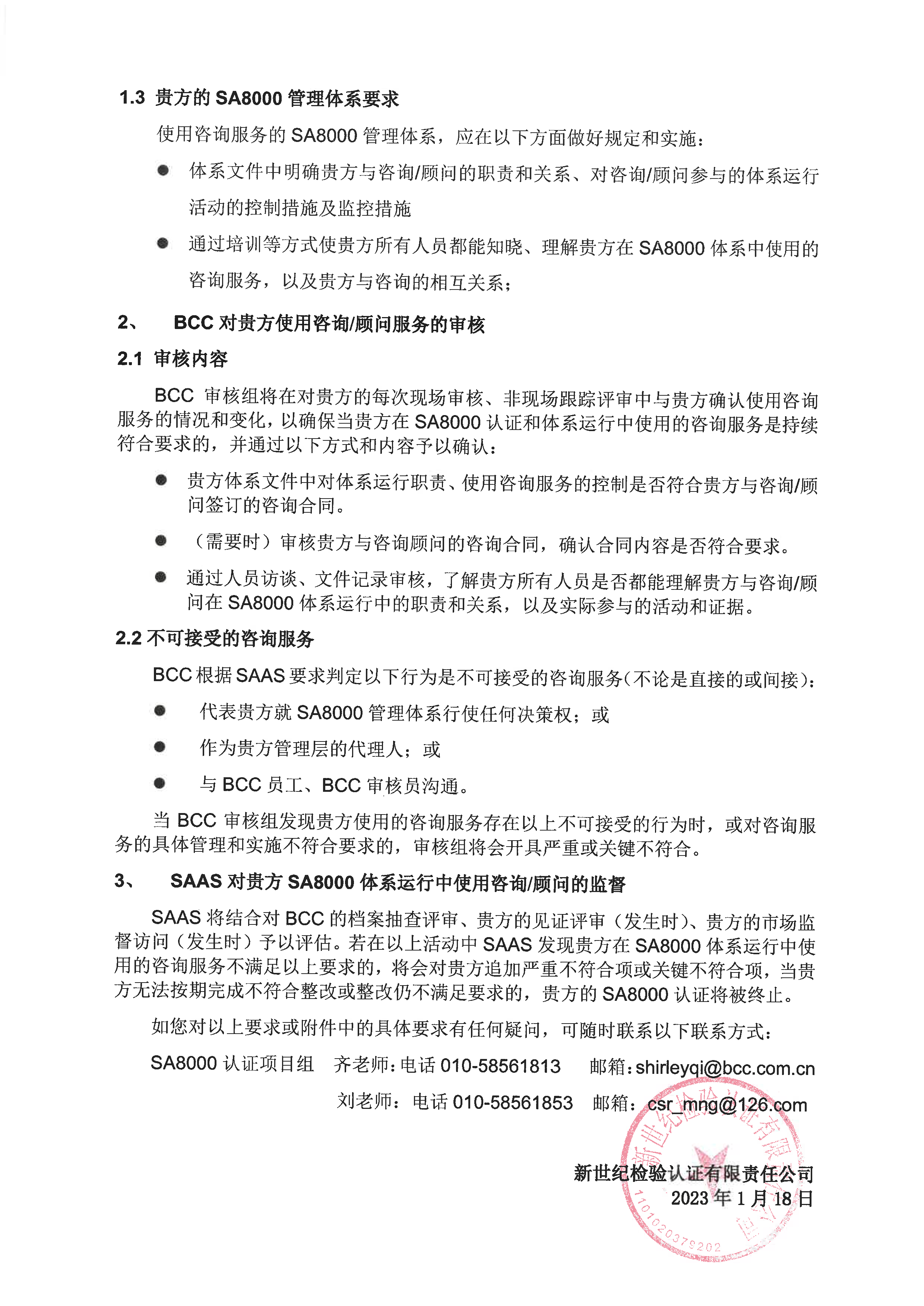 關(guān)于在SA8000體系認證中使用咨詢?nèi)藛T的告客戶書