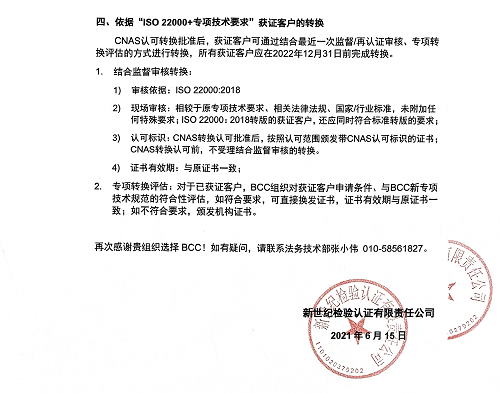 2021年7月1日(含)后通過認證決定的,依據(jù)本告知書第四條款通過專項轉(zhuǎn)換評估后,經(jīng)評估符合要求的,頒發(fā)依據(jù)“ISO22000:2018”的認證證書;經(jīng)評估不符合要求的,頒發(fā)BCC機構(gòu)證書;