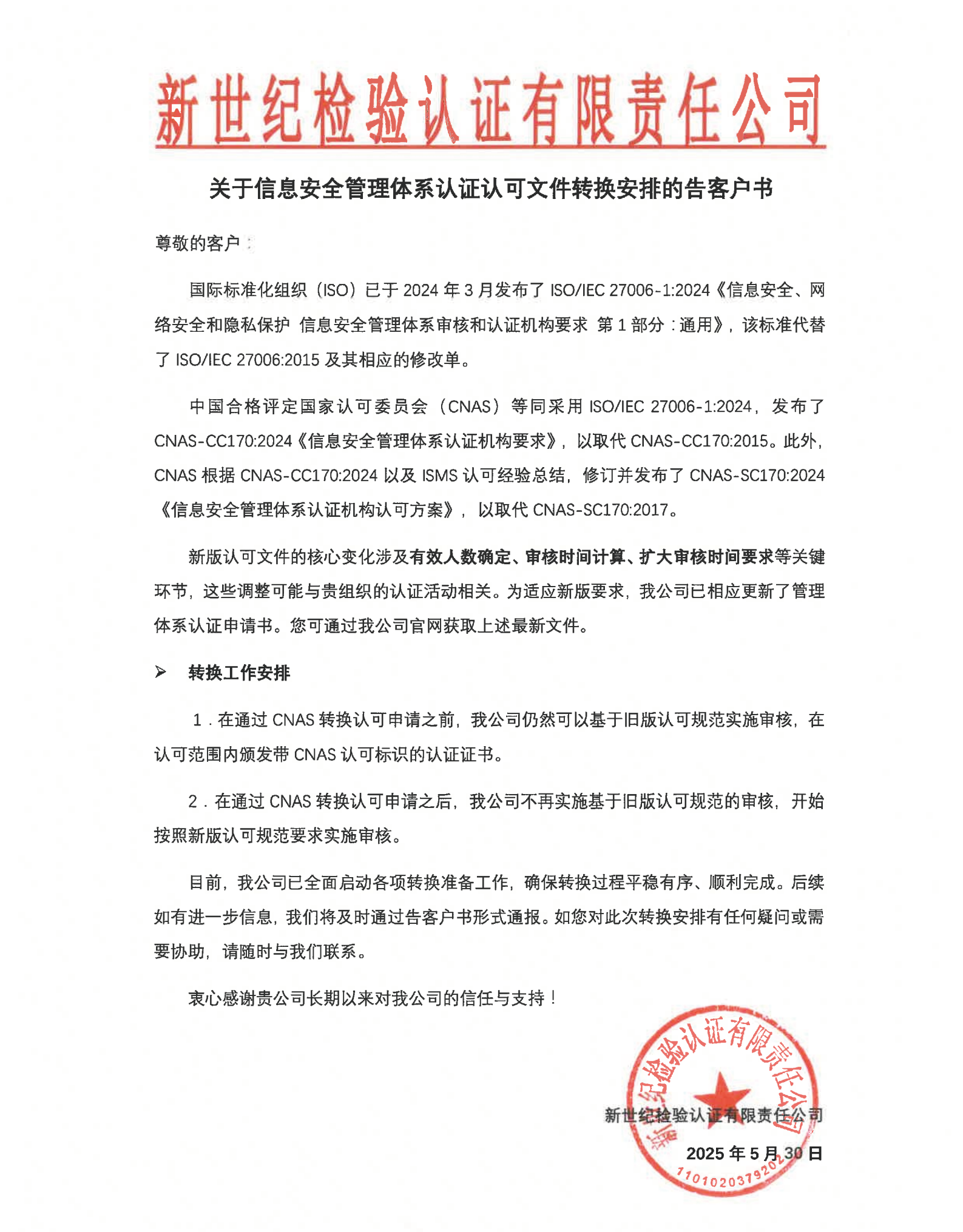 關(guān)于信息安全管理體系認(rèn)證認(rèn)可文件轉(zhuǎn)換安排的告客戶書