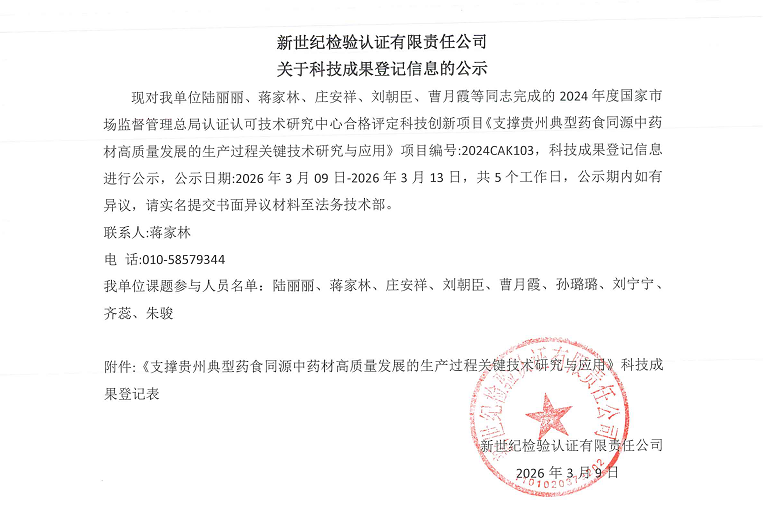 現(xiàn)對(duì)我單位陸麗麗、蔣家林、莊安祥、劉朝臣、曹月霞等同志完成的2024年度國家市場監(jiān)督管理總局認(rèn)證認(rèn)可技術(shù)研究中心合格評(píng)定科技創(chuàng)新項(xiàng)目《支撐貴州典型藥食同源中藥材高質(zhì)量發(fā)展的生產(chǎn)過程關(guān)鍵技術(shù)研究與應(yīng)用》項(xiàng)目編號(hào):2024CAK103,科技成果登記信息進(jìn)行公示,公示日期:2026年3月09日-2026年3月13日,共5個(gè)工作日,公示期內(nèi)如有異議,請實(shí)名提交書面異議材料至法務(wù)技術(shù)部。